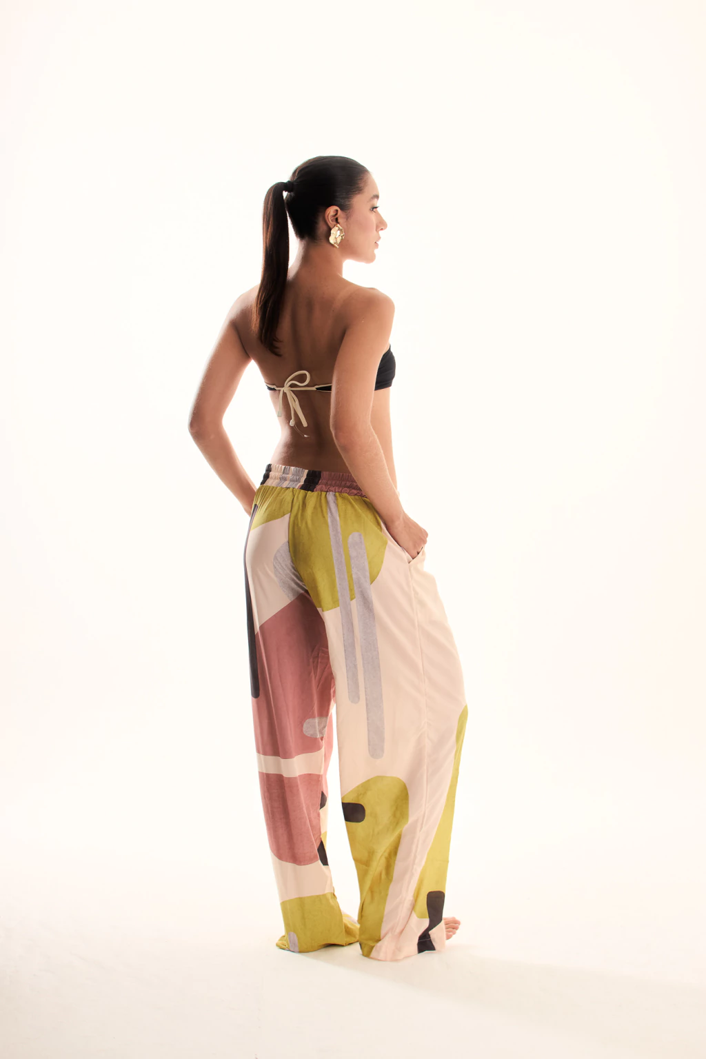 A calça artsy é a peça perfeita para quem busca um visual criativo e descontraído. Confeccionada em tecido leve de linho de alta qualidade com estampa artística exclusiva em blocos de cores que combinam rosa, verde chartreuse, preto e off white, ela apresenta uma modelagem ampla especial tipo pantalona que se adapta ao seu corpo, valorizando suas curvas com conforto absoluto e estilo contemporâneo.