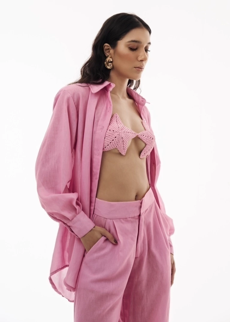 O top estrela rosa traz o toque artesanal icônico da marca, a calça fluida alonga a silhueta, e o camisão finaliza com sofisticação despretensiosa.