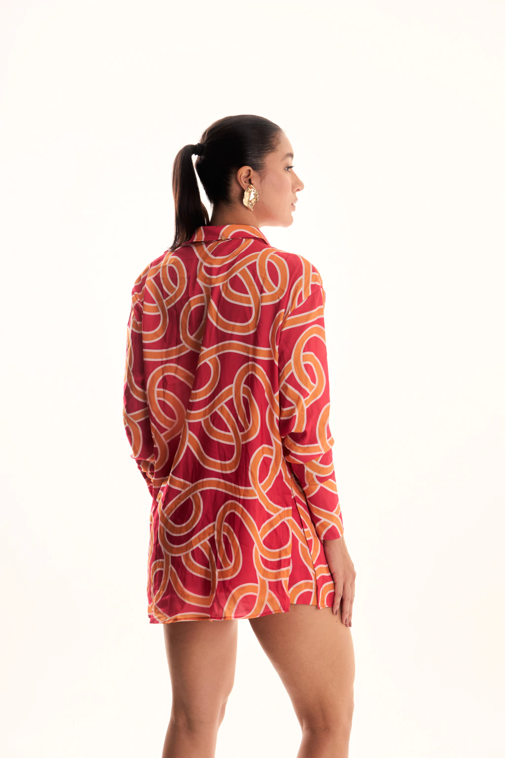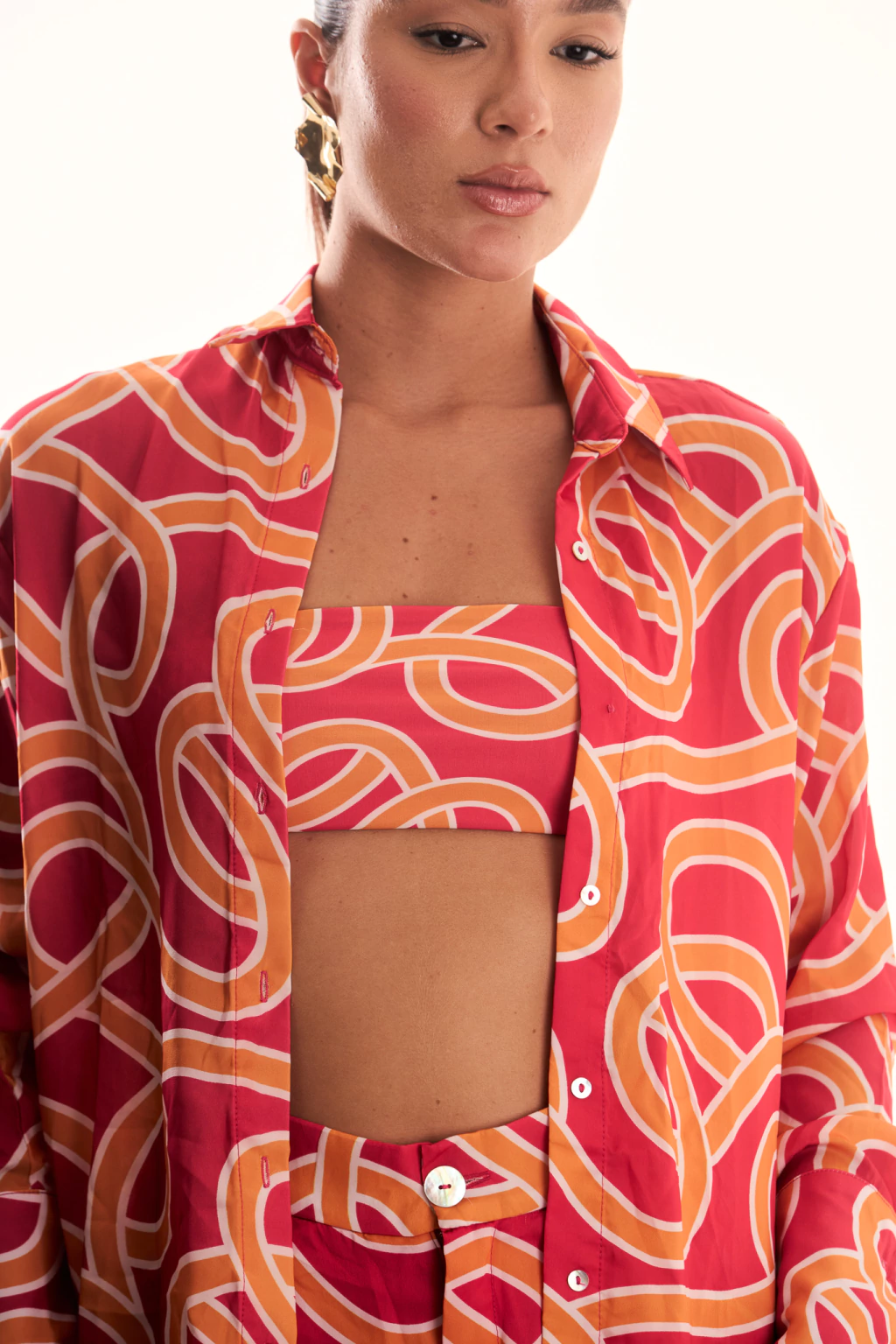 Com design diferenciado em formato de camisão alongado com gola clássica, a peça oferece conforto absoluto e o fechamento frontal em botões proporciona praticidade e versatilidade, enquanto as mangas longas com punhos garantem um caimento perfeito. A estampa gráfica de correntes entrelaçadas em tons quentes cria um look statement ousado e versátil, perfeito para transitar da praia ao destino urbano com sofisticação contemporânea e estilo único em qualquer ocasião.